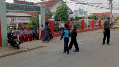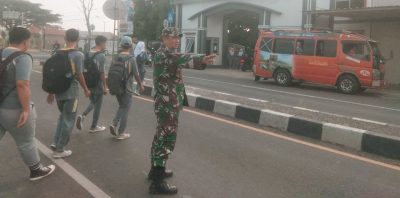 Cegah Laka lantas, Koramil 1610 Krangkeng Bantu Menyeberangkan Anak Sekolah